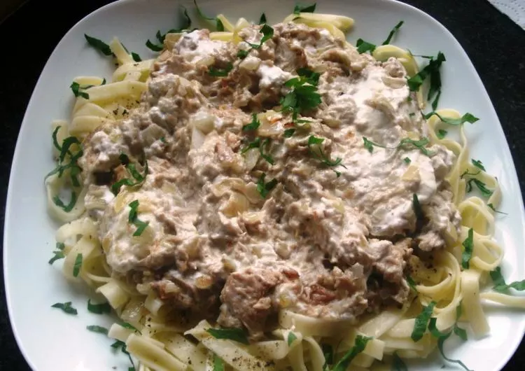 Zwiebel in Sonnenblumenöl glasig dünsten. Abgetropften Thunfisch zu den Zwiebeln geben und wenige Minuten (ca. 3) mit anbraten. Schmand unterrühren.